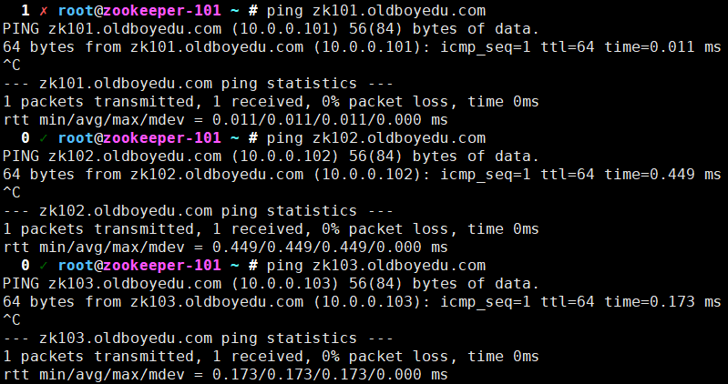 cat > /etc/hosts <<EOF 10.0.0.101 zk101.oldboyedu.com 10.0.0.102 zk102.oldboyedu.com 10.0.0.103 zk103.oldboyedu.com EOF
