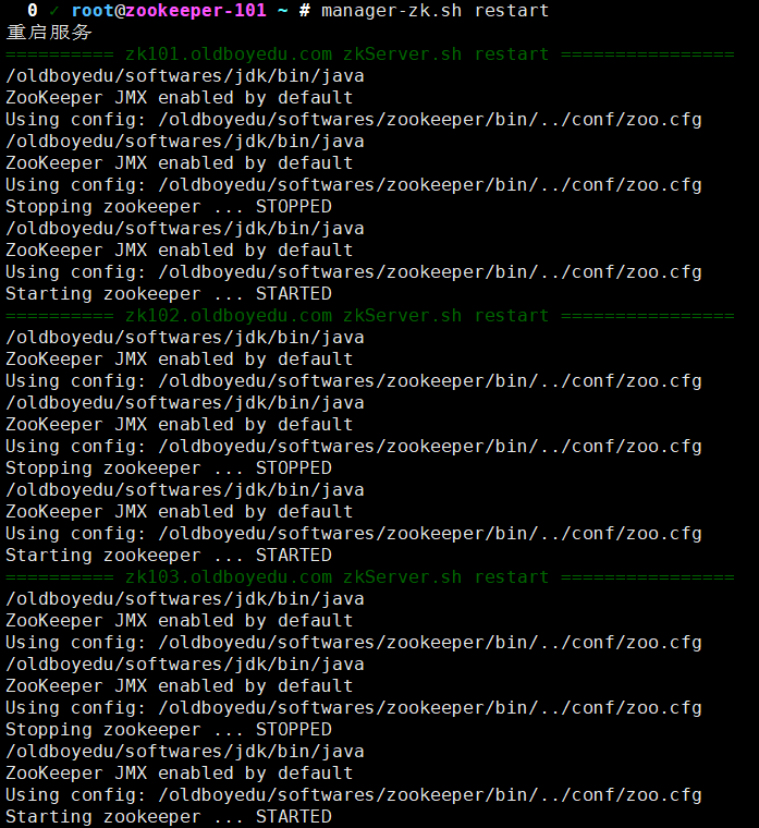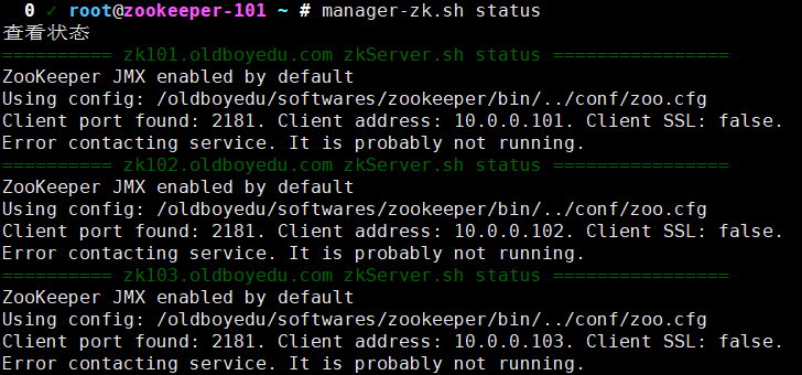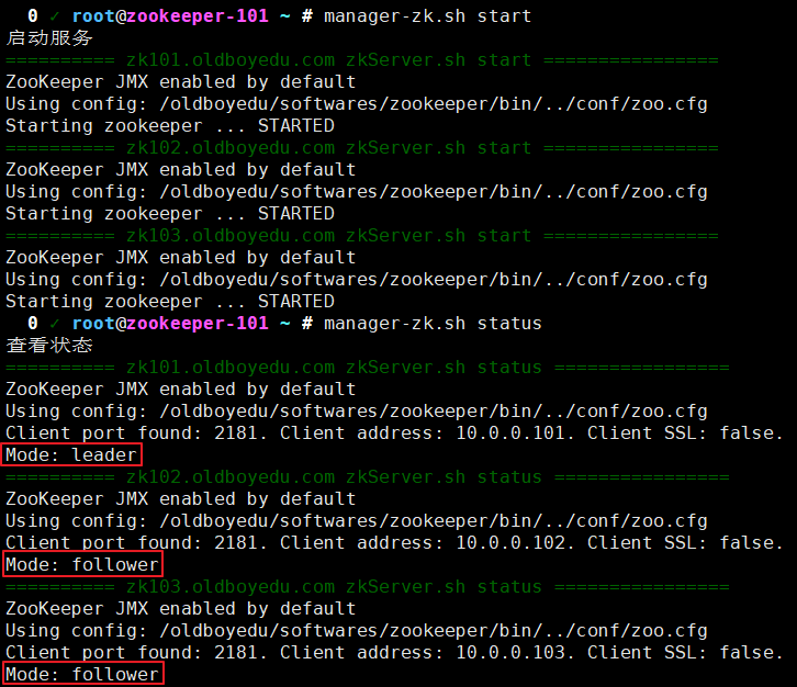 for (( i=101;i<=103;i++ )) do ssh zk${i}.oldboyedu.com "echo -n $i > /oldboyedu/data/zookeeper/myid" ;done| 查看zookeeper服务