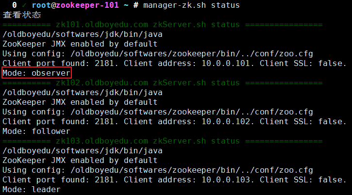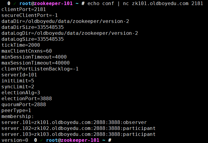 # egrep -v "^#|^$" /oldboyedu/softwares/zookeeper/conf/zoo.cfg tickTime=2000 initLimit=5 syncLimit=2 dataDir=/oldboyedu/data/zookeeper clientPort=2181 clientPortAddress=10.0.0.101 peerType=observer server.101=zk101.oldboyedu.com:2888:3888:observer server.102=zk102.oldboyedu.com:2888:3888 server.103=zk103.oldboyedu.com:2888:3888温馨提示:
