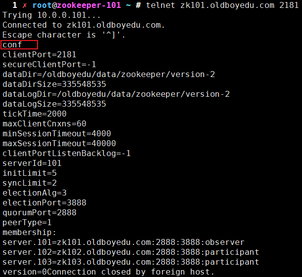 # telnet zk101.oldboyedu.com 2181 Trying 10.0.0.101... Connected to zk101.oldboyedu.com. Escape character is ^]. conf