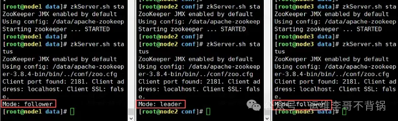 复制vi /etc/profile # 尾部添加 export ZOOKEEPER_HOME=/data/apache-zookeeper-3.8.4-bin export PATH=$ZOOKEEPER_HOME/bin:$PATH # 使配置文件生效 source /etc/profile1.2.3.4.5.6.7.8. 6. 启动 Zookeeper 复制zkServer.sh start zkServer.sh status1.2.确认 3 台机器都正常启动,其中两台为fllower,一台为leader,则zookeeper集群安装成功。