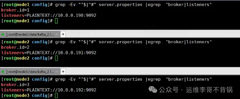broker.id:Kafka Broker 唯一 ID。企商汇node1=1, node2=2, node3=3。listeners:服务监听地址和端口。需要换成真实的IP地址,每个节点填本机IP地址log.dirs:存储 Kafka 消息日志的目录。建议挂载大容量磁盘。num.partitions:Topic 默认分区数,决定并行消费能力。zookeeper.connect:连接zookeeper。3. 配置拷贝到另外两个节点 复制scp -r /data/kafka_2.13-3.9.1 root@10.0.0.191:/data scp -r /data/kafka_2.13-3.9.1 root@10.0.0.192:/data1.2.注意:节点2和节点3需要修改broker.id和linsteners两个配置