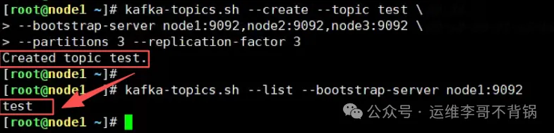 1. 创建 Topic 复制kafka-topics.sh --create --topic test \ --bootstrap-server node1:9092,node2:9092,node3:9092 \ --partitions 3 --replication-factor 31.2.3.参数解析: