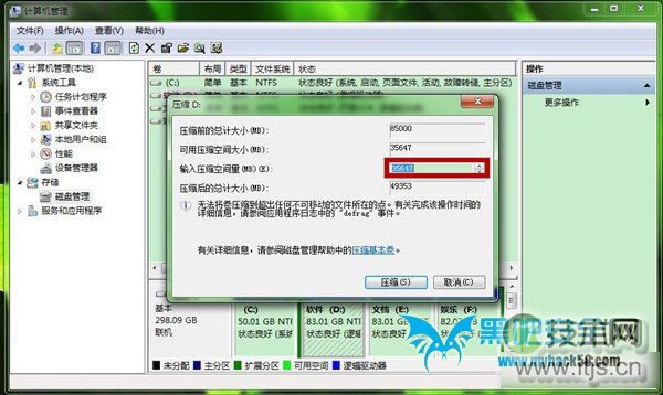 第五步、系统会弹出“压缩”窗口,可输入部分默认的是:可压缩容量。我们可以输入想获得以M为单位的磁盘容量,多少可以自定,注意1G=1024M,然后再点击“压缩”。