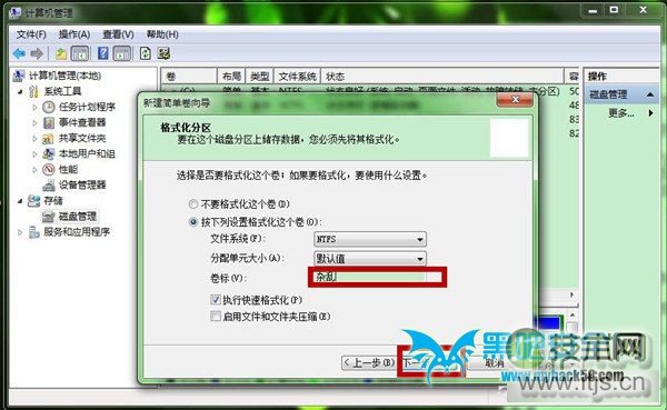 第十一步、我们再“格式化分区”中,可以为这个新加卷命名,再点击“下一步”。