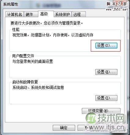 下来,在系统属性窗口中,选择“高级”选项卡,其实在上一步已经选择了“高级”选项卡了,无需再做这一步。直接点击“设置”,如图 5所示。