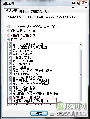 跟着就到了最后一步也是最重要的一步了,点击“设置”之后,云南idc服务商会进入到“性能选项”的对话框,选择“视觉效果”栏,在众多的效果中找到“在桌面上为图标标签使用阴影”选项,如图 6所示,将前面的“√”去掉,点击“确定”即可完成了。