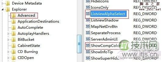 找 到“software”--“Microsoft”--“CurrentVersion” --“Explorer” --“Advanced” ,打开“Advanced” 选项中,在右侧栏中找到“ListviewShadow”和“ShowCompColor”两个键。如图 9所示。