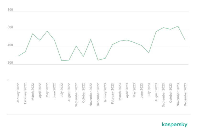实际结果:部分实现2023年,卡巴斯基预测来自暗网的泄露数据可能会被用于策划攻击而非直接攻击。事实证明,暗网上泄露的用户凭据数量明显增加,这表明攻击者对这类信息的需求不断增长。这种需求源于这样一个事实,即它是未经授权访问企业网络基础设施的最简单方法之一。