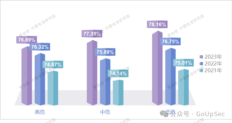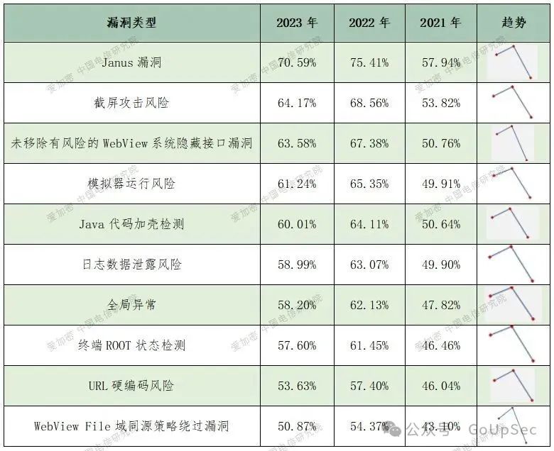 各等级风险漏洞情况移动应用大数据平台利用安全检测引擎对有更新的应用,进行140项漏洞扫描。检查结果显示:有高达76.89%的应用被识别为高危应用。这个比例相比于过去两年有了2.02%的小幅增长。数据表明,尽管我们在技术和安全措施上有所进步,但高危漏洞在移动互联网应用中的存在仍然是一个严重的问题,因为它意味着我们的个人信息、网站模板财务信息和其他重要数据可能会因为这些漏洞而受到威胁。