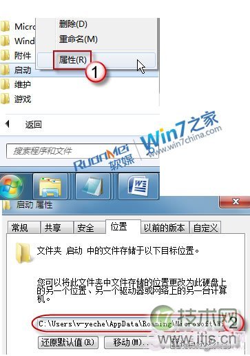 按“开始”按钮,在程序菜单中找到“启动”,右键鼠标选择“属性”;在“位置”选项卡上我们可以看到完整的路径。