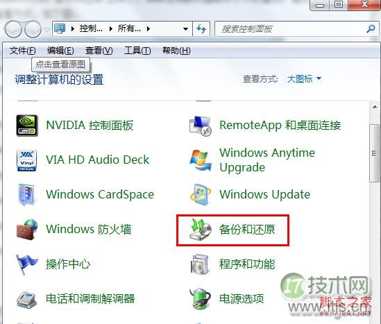 2、服务器托管进入控制面板后即可找到“备份和还原”工具了,假如觉得默认图标太小不好查找,请点击控制面板右侧的“大图标”查看方式,如下图: