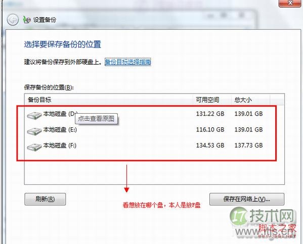 3、点击“备份和还原”后即可进入备份还原设置界面,我们首先点击“设置备份”,之后会进入备份设置,主要是设置将备份文件存放在哪个盘,如下如图: