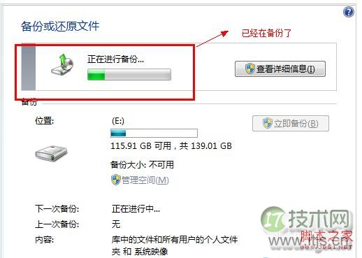 设置Windows 7备份 之后会提示我们将系统备份文件保存到什么位置,以下演示的是将备份文件存放在D盘,然后点击右侧的“立即备份”即可,等待一段时间即可完成备份了,如下图: