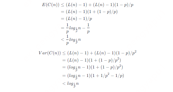 经过分析得出,跳跃表在级别L上期望的节点数量是1p,当L=log1pn时这是成立的[1]。在此可以定义L(n)来代表log1pn。