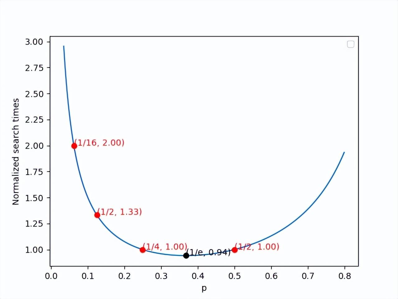 不难看出,对于任意确定的n,ln(n)都是确定的,因此只需要分析1pln(1p)的变化趋势就可以。为了更好的进行对比,以p=12为基础值进行标准化,Figure.11就是随着p的变化,搜索时间的变化趋势,其中p=1e的点是搜索时间最好的点,但是二的整数次幂可以更好地进行随机级别的生成。