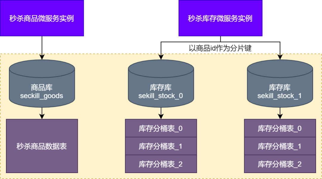 可以看到,对于商品商品库存来说,分库分表后,会分成一个商品库和两个库存库,其中商品库中存放的是秒杀商品信息,主要在用户抢购下单的业务场景中,以读操作为主。