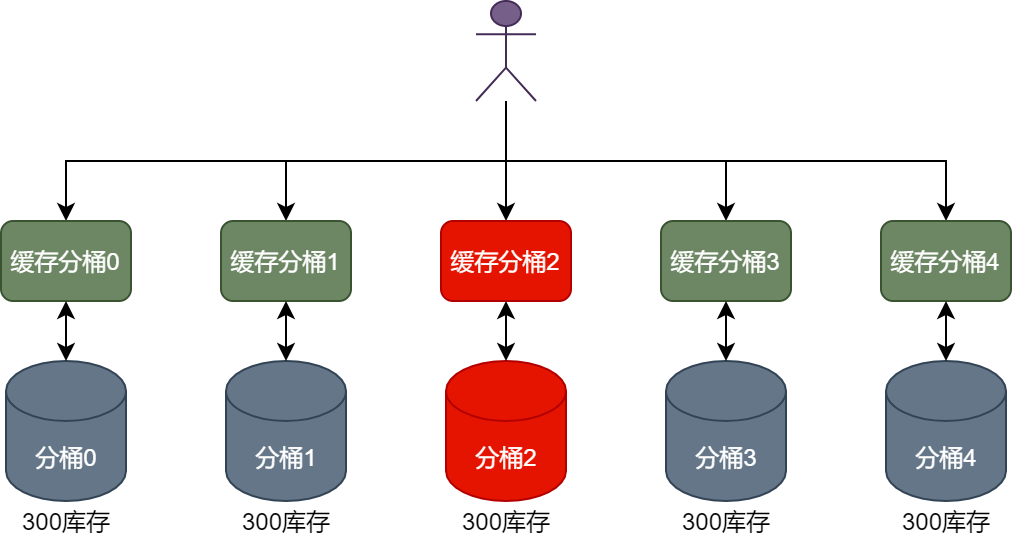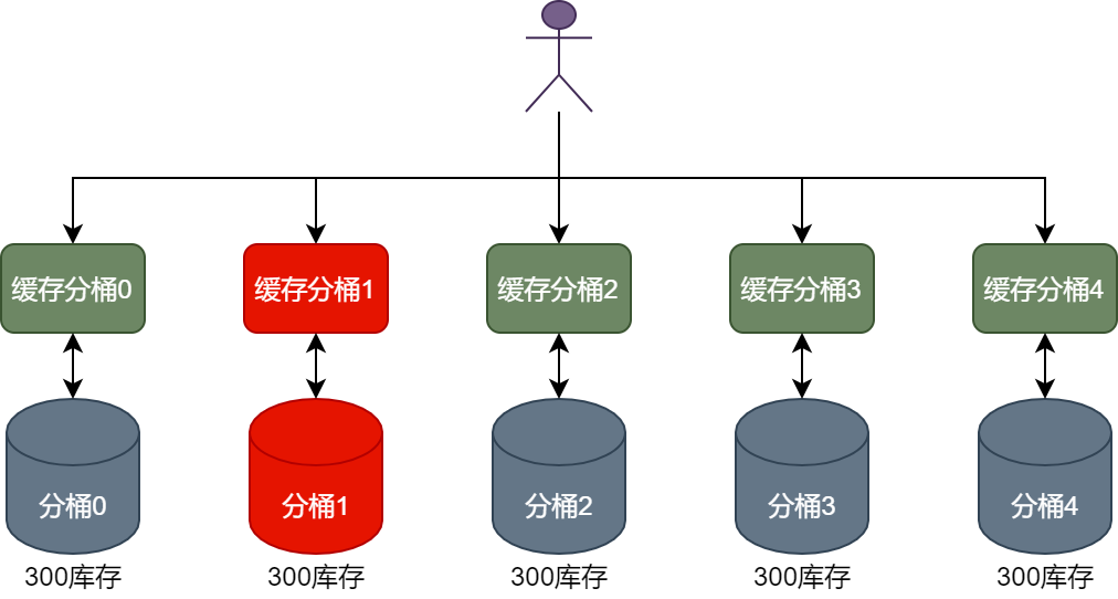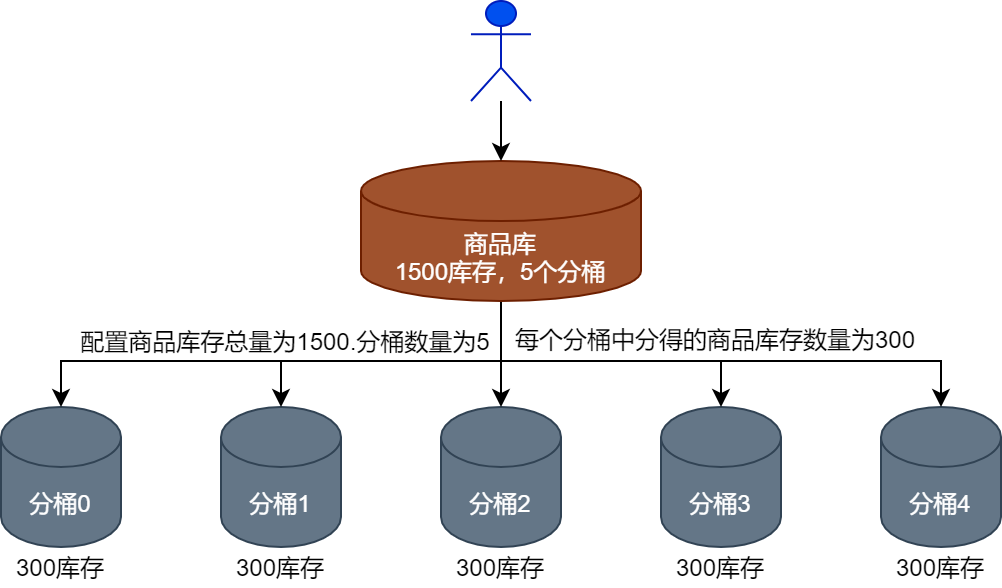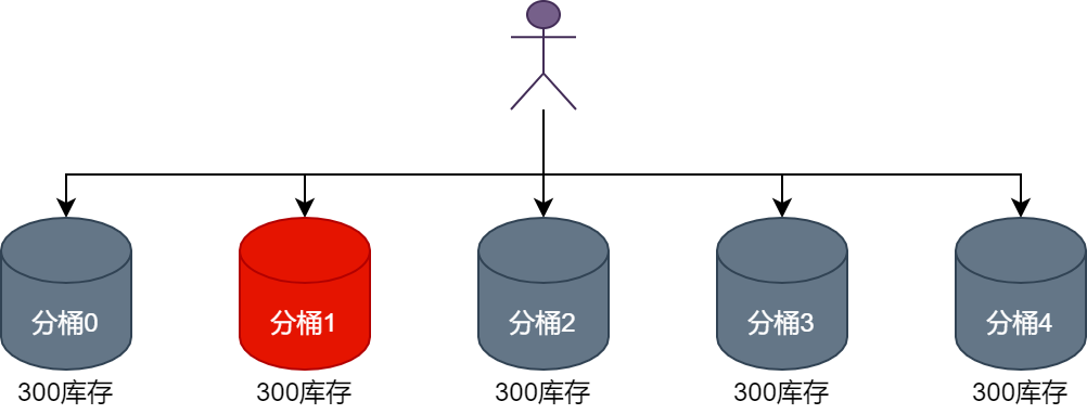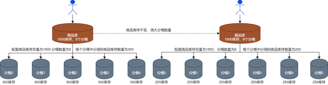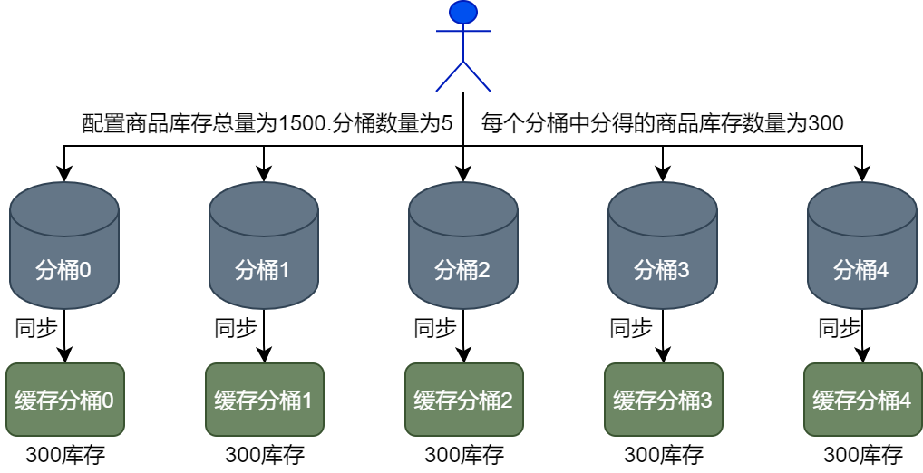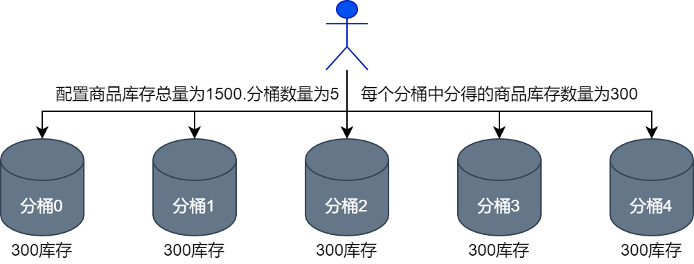 商品库存在缓存层面的分桶设计与在数据库层面的分桶设计规则保持一致,例如,运营人员要将1500个商品分配到5个分桶中,则每个缓存分桶和数据库分桶中都会分得300个商品库存,如下图所示。