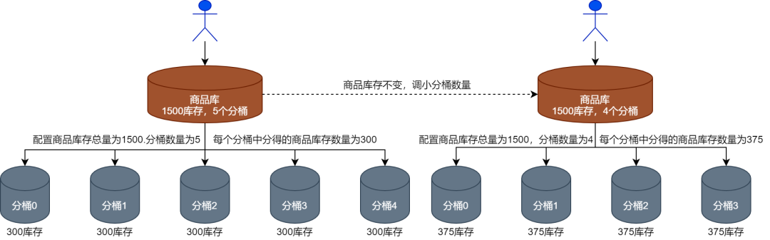 如果确实存在某些分桶中的库存无法售罄的情况,则可以通过人工干预的方式收缩库存分桶,将没有售罄的分桶库存收缩到一个分桶中,这样将相当于库存没有分桶了,后续所有的请求都会被路由到同一个库存分桶中,最终库存都会被售罄。