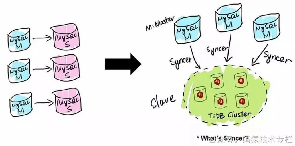 TiDB 应用的第一类场景是 MySQL 的分片与合并。对于已经在用 MySQL 的业务,分库、分表、分片、中间件是常用手段,随着分片的增多,跨分片查询是一大难题。TiDB 在业务层兼容 MySQL 的访问协议,PingCAP 做了一个数据同步的工具——Syncer,它可以把黄东旭 TiDB 作为一个 MySQL Slave,将 TiDB 作为现有数据库的从库接在主 MySQL 库的后方,在这一层将数据打通,可以直接进行复杂的跨库、跨表、跨业务的实时 SQL 查询。黄东旭提到,“过去的数据库都是一主多从,有了 TiDB 以后,可以反过来做到多主一从。”