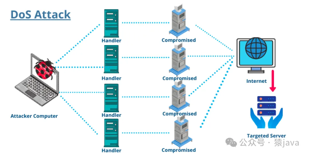TCP防护:优化TCP连接处理机制,避免SYN Flood等攻击。缓存和压缩:使用缓存减少服务器响应的压力,使用压缩技术减少带宽消耗。6. 总结本文,我们详细地分析了 DDoS攻击以及工作原理和预防措施,它是一种常见且破坏力强大的网络攻击手段。尽管,DDoS攻击更多面向的是安全和运维人员,但是作为程序员,我们也需要学会如何识别和防御 DDoS攻击,这样我们才能更好地做好系统服务自保。