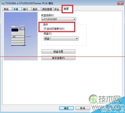3、打开属性菜单后,会出现一个显示打印机属性的窗口,单击“配置”选项卡,勾选“选件”下的“自动双面单元”。