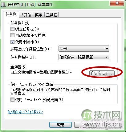 第三步:进入“属性”程序,正的图点击“通知区域”的“自定义”。