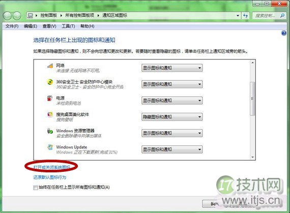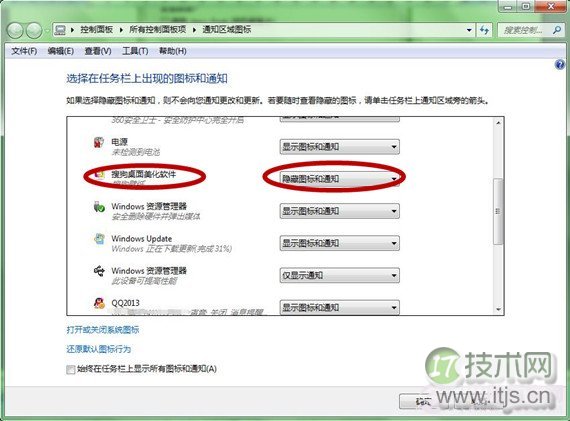 第四步:你可以看到以下画面,我们先来看看“选择在任务栏上出现的图标和通知”,我往下拉找到了很多不常用的图标。如“搜狗桌面美化软件”,我的电脑每天都会使用,为我更新桌面图片,但我又不需要天天打开它,我就选择了“隐藏图标和通知” 。你可以根据你的实际情况进行选择。