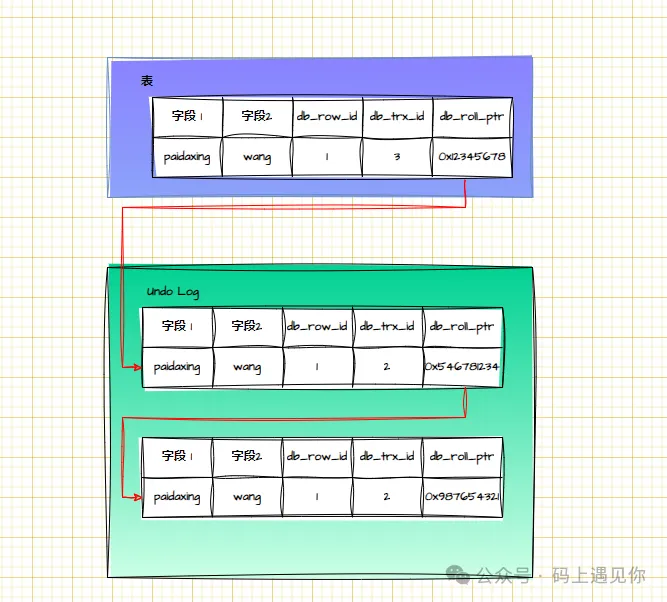 db_row_id:隐式主键。如果表没有创建主键,将使用该字段创建聚簇索引。db_trx_id:最后一次修改该记录的事务ID。db_roll_ptr:回滚指针,指向记录的上一个版本,在本质上指向Undo Log中的前一个版本的快照地址。由于每次记录更改之前都会先将一个快照存储到undo log中,这些隐式字段也会与记录一起保存在undo log中。因此,每个快照中都包含一个db_trx_id字段,表示最后一次修改该记录的亿华云计算事务ID,以及一个db_roll_ptr字段,指向前一个快照的地址。(db_trx_id和db_roll_ptr是重点,将在后续中用到)