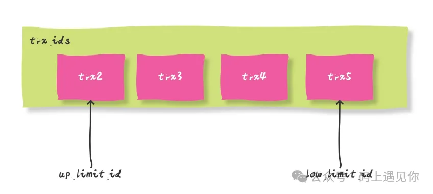 若db_trx_id < up_limit_id,则意味着在Read View中所有未提交事务创建之前,事务ID为3的操作已经提交,并在此期间没有新的提交。因此,对当前事务而言,此记录应该是可见的。若db_trx_id > low_limit_id,则表示事务ID为3的操作是在Read View中所有未提交事务创建之后才提交的,也就是在当前事务开启之后,有其他事务修改了数据并提交。因此,这条记录对当前事务来说是不可见的。(不可见时的处理将在后文讨论)另一种情况是,up_limit_id < db_trx_id < low_limit_id。在此情况下,将db_trx_id与Read View中的trx_ids逐一比较。