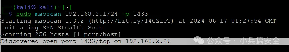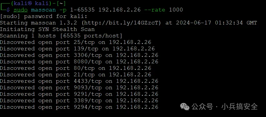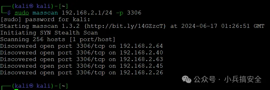(1)扫描B段(256个主机)某个特定端口例如3306 复制sudo masscan 192.168.2.1/24 -p 33061.