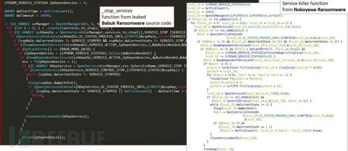 举个例子,终止进程与服务以减少被其他程序锁定文件的数量。这一点上,b2b供应网Nokoyawa 的代码与 Babuk 的代码完全一致。