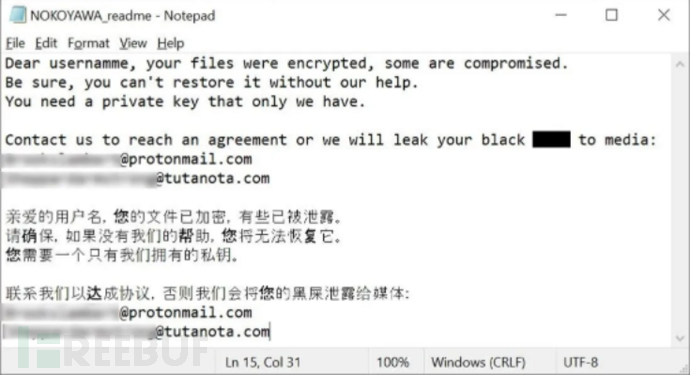 被勒索软件加密的文件会附加 .NOKOYAWA的扩展名,赎金勒索信息被写入每个加密目录中的 NOKOYAWA_readme.txt中。