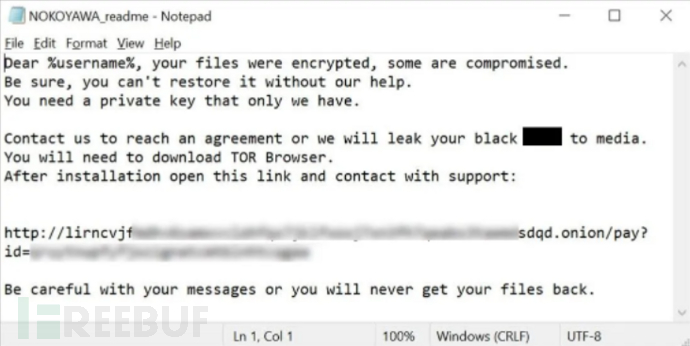 值得注意的是,攻击者威胁会将数据泄露出去。但研究人员并未发现 Nokoyawa 样本具备这种能力。这很可能是攻击者虚张声势,迫使受害者支付赎金。