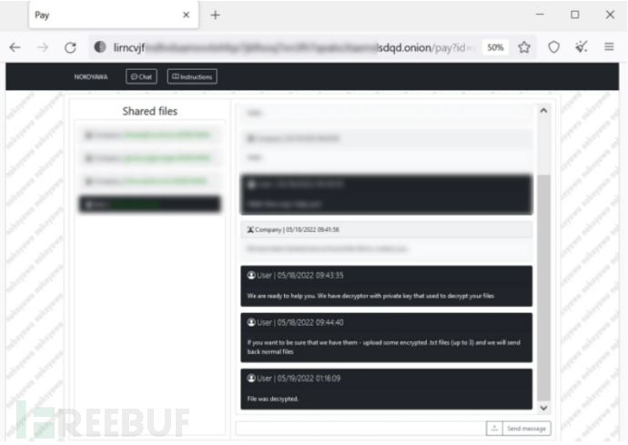 访问暗网网站会进入在线聊天页面,受害者可以与攻击者沟通协商并支付赎金。研究人员观察到潜在受害者与攻击者的对话,攻击者表示可以提供最多三个文件的免费解密,证明能够解密: