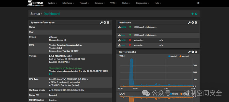 pfSense(https://www.pfsense.org/)是一个基于FreeBSD的多功能开源防火墙和路由器发行版。它提供了强大且可定制的解决方案来提高网络安全性。其功能(例如 VPN 支持、流量整形和入侵检测)是任何路由器/防火墙的基础。其用户友好的界面使 pfSense 非常适合家庭和企业使用。