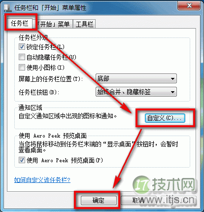 2,企商汇右下点击“属性”后会弹出“任务栏和 [开始 ]菜单属性”,角显点击“任务栏” --“自定义” --“确定”,统中图标如图2: