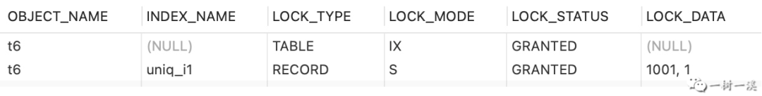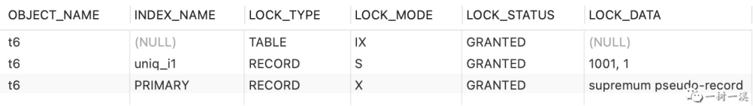 复制BEGIN; INSERT INTO `t6`(i1) VALUES(1001);1.2.通过 BEGIN 显式开启事务,INSERT 执行完成之后,我们可以通过以下 SQL 查看加锁情况:
