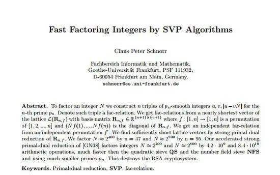 据悉,这份论文名为《通过SVP算法快速分解整数》,作者Claus Schnorr,现年77岁,于2011年从约翰·沃尔夫冈·歌德大学退休。他是一位受人尊敬的密码学家,Schnorr签名算法便是以他的名字命名。在密码学中,Schnorr 签名是由 Schnorr 签名算法产生的数字签名,它是一种数字签名方案,以其简单高效著称,其安全性基于某些离散对数问题的难处理性。由于Schnorr签名算法可以构建更高效和隐私性更强的区块链系统,一直备受区块链开发者们的关注。