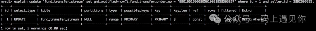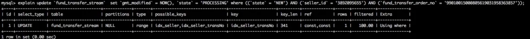 复制update fund_transfer_stream set gmt_modified=now(),state = #{state} where fund_transfer_order_no = #{fundTransferOrderNo} and seller_id = #{sellerId} and state = NEW1.2.3.4.可以看到,我们的同一个事务中执行了两条 Update 语句,这里分别查看下两条 SQL 的执行计划: