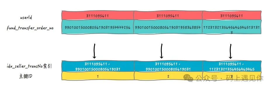 因为 fund_transfer_order_no 只是普通索引,而非唯一性索引。又因为在一种特殊情况下,会有同一个用户的两个 fund_transfer_order_no 的前 20 位相同,这就导致两条不同的记录的索引值一样(因为 seller_id 和 fund_transfer_order_no(20)都相同 )。