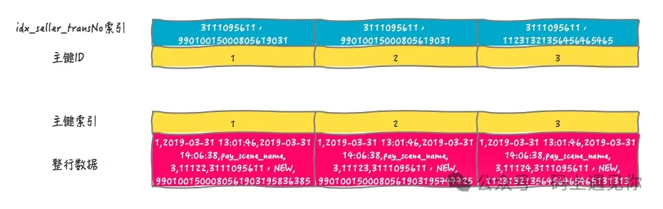有了以上已知信息,我们现在可以开始排查死锁的原因及其根本原理了。通过分析死锁日志,并结合我们的代码和数据库表结构,我们发现主要问题出在我们的 idx_seller_transNo 索引上: