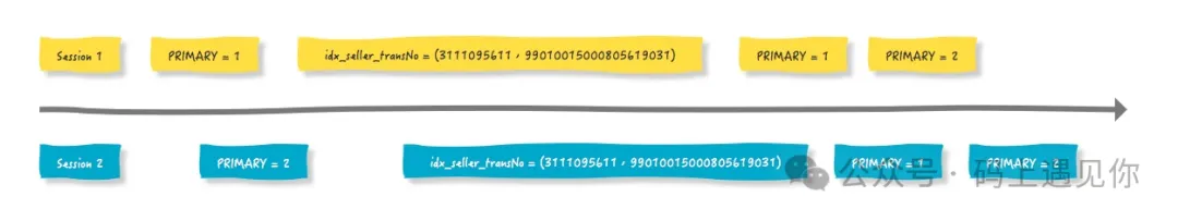 结合以上两张图,我们发现了导致死锁的原因:事务 1 执行 update1 占用 PRIMARY = 1 的锁 ——> 事务 2 执行 update1 占有 PRIMARY = 2 的锁;事务 1 执行 update2 占有 idx_seller_transNo = (3111095611,99010015000805619031)的锁,尝试占有 PRIMARY = 2 锁失败(阻塞);事务 2 执行 update2 尝试占有 idx_seller_transNo = (3111095611,99010015000805619031)的锁失败(死锁);