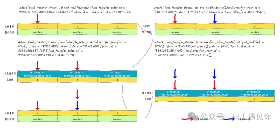 然而,修改了 idx_seller_transNo 索引的前缀长度后,要注意确保在实际执行 update 语句时,MySQL 查询优化器确实选择了使用 fund_transfer_order_no 索引。如果优化器在代价分析后仍然决定使用索引 KEY idx_seller(seller_id),那么死锁问题仍可能存在,这与本文中的原理类似。