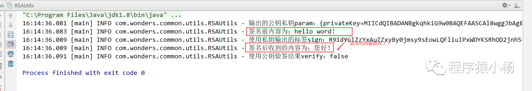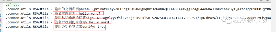 复制//测试使用 public static void main(String[] args) throws Exception { //1、获取公私钥匙 请求方获取公钥私钥后,传私钥发送请求 Map<String,Object> param=RSAUtils.genKey(); log.info("输出的公钥私钥param:"+param); String publicKey= (String) param.get("publicKey"); String privateKey= (String) param.get("privateKey"); //2、签名 获取私钥,获取请求后对内容进行加标签返回 String cnotallow="您好!"; String sign=RSAUtils.sign(content, privateKey); log.info("使用私钥输出的标签sign:"+sign); //3、验签 // String cnotallow="您好!"; boolean verify=RSAUtils.verify(content, sign, publicKey); log.info("使用公钥验签结果verify:"+verify); }1.2.3.4.5.6.7.8.9.10.11.12.13.14.15.16.17.18.测试结果: