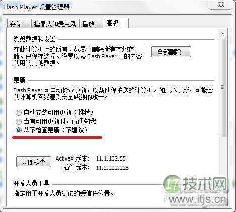 5、把更新设为“从不检查更新”,这样就避免了自动更新对开机速度造成影响了。需要注意的是这样就不能及时获得Adobe Flash Player的更新,会对系统安全造成一定的影响,源码下载建议定期手动检查更新