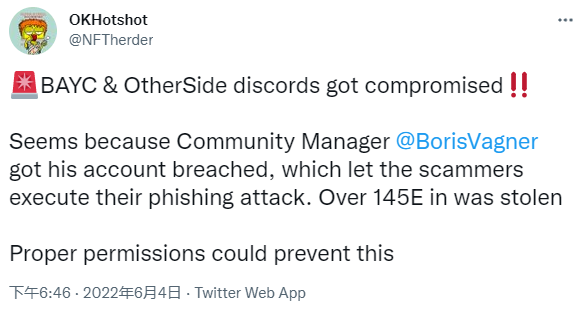 在安全研究人员于 Twitter 上曝出漏洞 11 小时后,证实“无聊猿”NFT 背后的被黑 Yuga Labs 公司终于证实,其 Discord 服务器于周六遭到了黑客攻击、损失并导致价值 200 ETH(约 36 万美元)的价值 NFT 被盗。CoinDesk 指出,证实事件源于社区经理 Boris Vagner 的被黑 Discord 账户被盗,之后攻击者利用该账户在官方 BAYC 及元宇宙项目中发布了钓鱼链接。损失