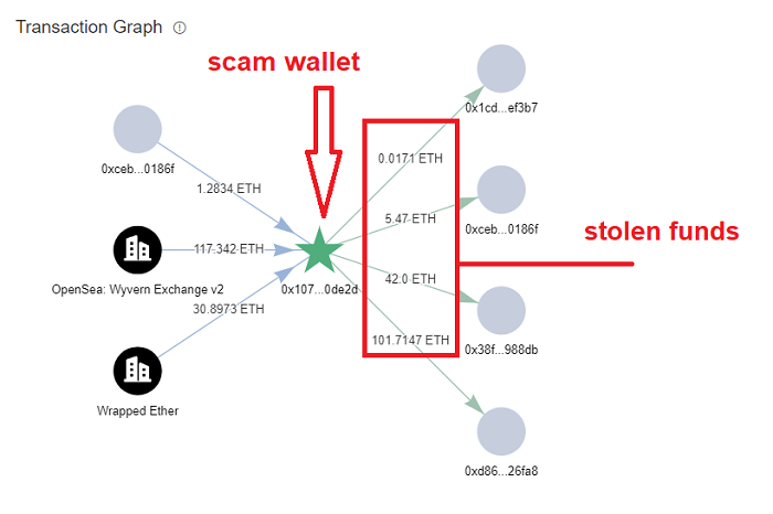 Twitter 网友 @NFTherder 率先曝光了此事,价值同时他预估有 145 ETH(约 26 万美元)随 NFT 一同被盗,证实后续追查表明被盗资金被转入了四个单独的被黑钱包地址。