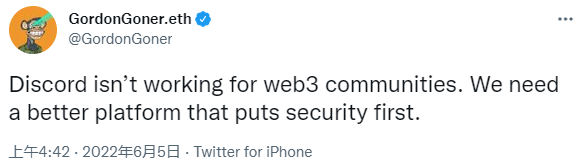 Gordon Goner 在推文中写道:“Discord 并不适用于 Web 3 社区,我们需要一个将安全放在首位的更好的平台”。