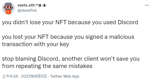 即便如此,@stevefink 还是在推文中驳斥道 —— 你并不会因为使用 Discord 而丢失 NFT,真相是你用手欠点击了恶意的交易链接。在缺乏安全意识的情况下,换个客户端也无法避免你重蹈覆辙。